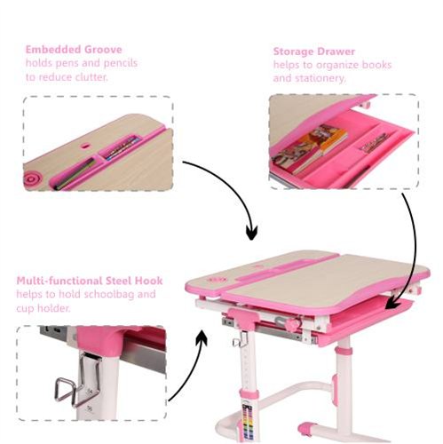 As one of Scholar Series, this desk & chair suit provides pulled drawer to meet the larger storage demand. Tiltable desktop with 0° to 45° angle satisfies the need of writing, reading and drawing. Height adjustment design enables favorable seating posture for different age stages. Winged backrest eases the pressure of lumbar spine and provides comfortable seating experience.