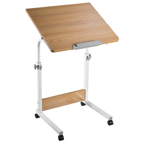 This table adopts E1 grade environmental protection particle board and base is made of high-strength carbon steel. The desktop angle is adjusted from 0° to 80° - reading, painting, writing and working to meet daily needs. The height adjustable mechanism operates with rotary knob for dynamic study or work. With four high quality wheels with brakes, it allows you relocate the table easily.