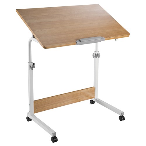 This table adopts E1 grade environmental protection particle board and base is made of high-strength carbon steel. The desktop angle is adjusted from 0° to 80° - reading, painting, writing and working to meet daily needs. The height adjustable mechanism operates with rotary knob for dynamic study or work. With four high quality wheels with brakes, it allows you relocate the table easily.